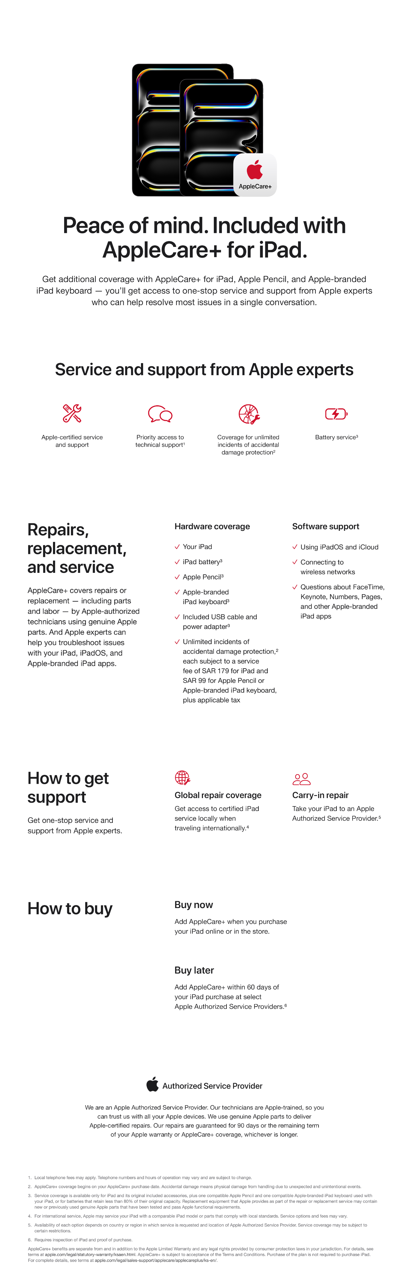Every iPad comes with a one-year limited warranty and 90 days of technical support. AppleCare+ for iPad extends your coverage and adds unlimited incidents of accidental damage protection. In addition, you’ll get priority access to Apple experts by chat or phone. *
