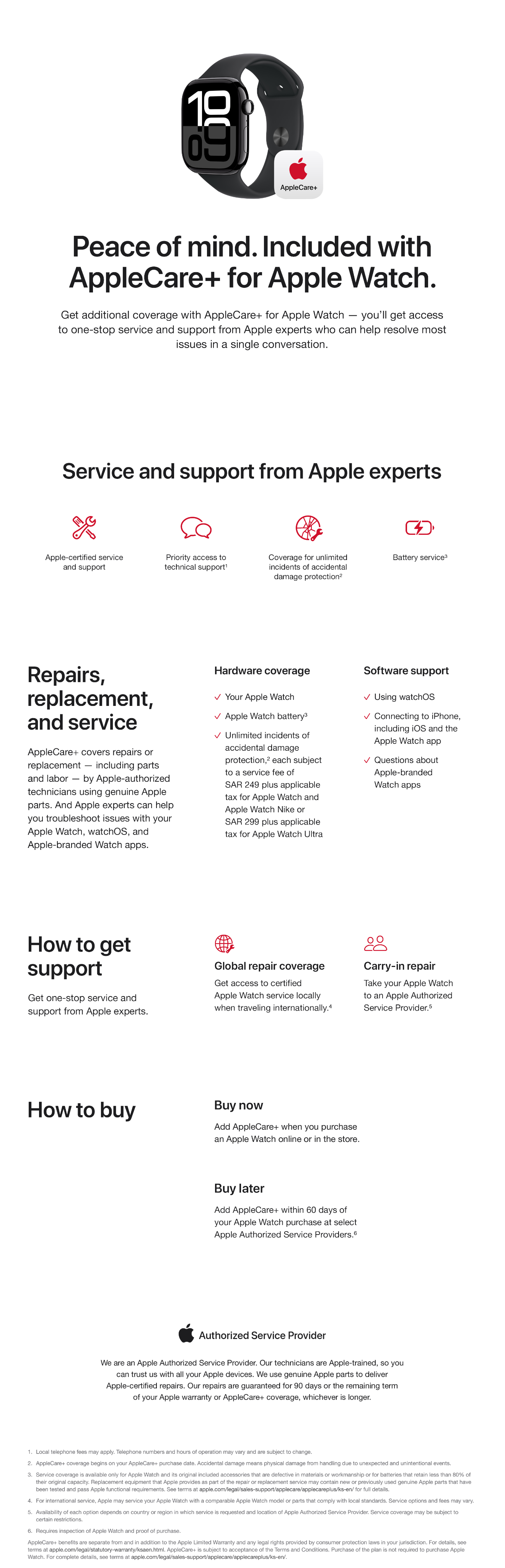 Every Apple Watch comes with a one-year limited warranty and 90 days of technical support. AppleCare+ for Apple Watch extends your coverage and adds unlimited incidents of accidental damage protection. In addition, you’ll get priority access to Apple experts by chat or phone. *